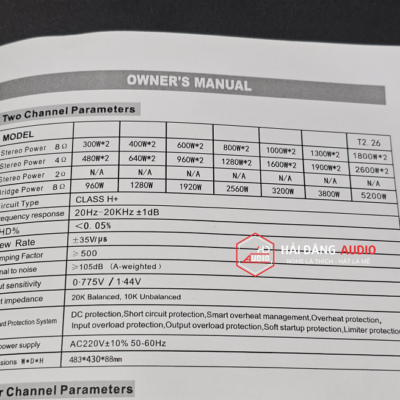 ✅ Công suất lớn: 1800W x 2 (ở 8Ω), 2600W x 2 (ở 4Ω) – Đánh ngọt mọi dòng loa full, sub